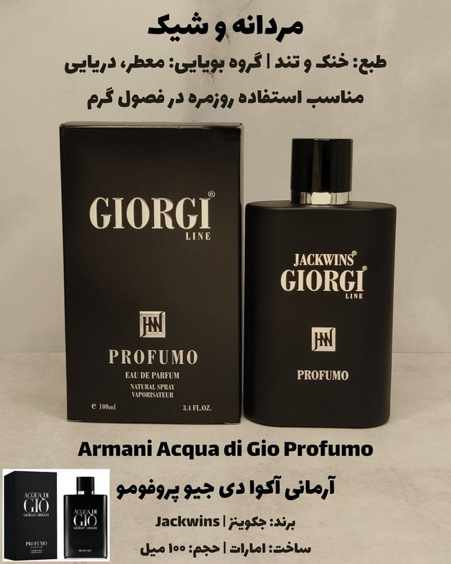 ادکلن جورجیو آرمانی آکوا دی جیو پروفومو یک ادو پروفیوم فشرده از نتهای تازه دریایی همراه با گیاهان و ادویهها است عطر مردانه توسط آلبرتو موریلاس، ستاره عطرساز اسپانیایی، در سال ۱۹۹۶ به وجود آمد. عطر جیورجیو آرمانی دی جیو پروفومو در دسته عطرهای معطر دریایی قرار میگیرد، اما طعم ادویه چوبی هم در آن بهوضوح قابلتشخیص است