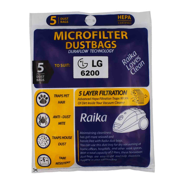 سایر توضیحات: - مناسب جاروبرقی ال جی 6200 - حاوی 5 عدد پاکت در یک بسته - ساخته شده از مرغوبترین پارچه 5 لایه - ضد باکتری - دارای کیفیت مناسب برای افزایش عمر موتور جاروبرقی